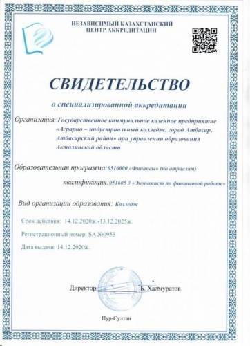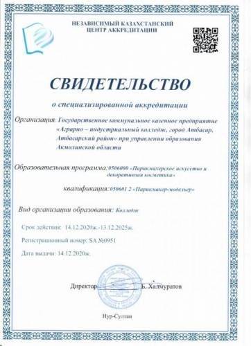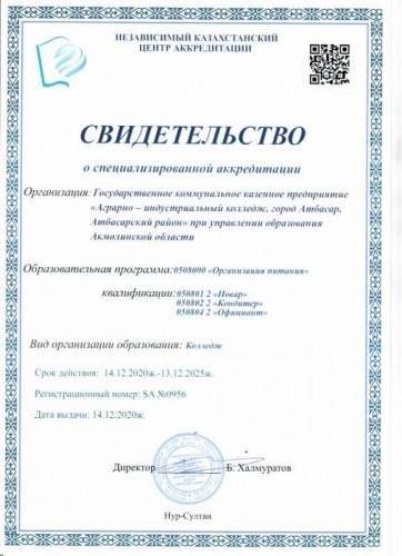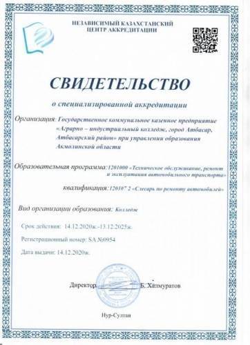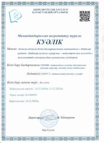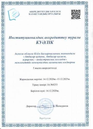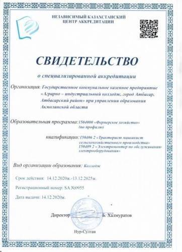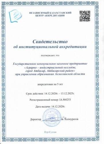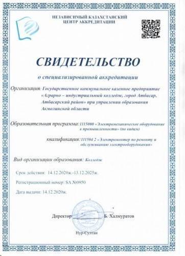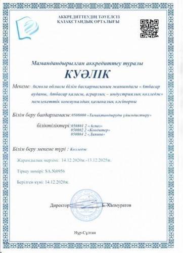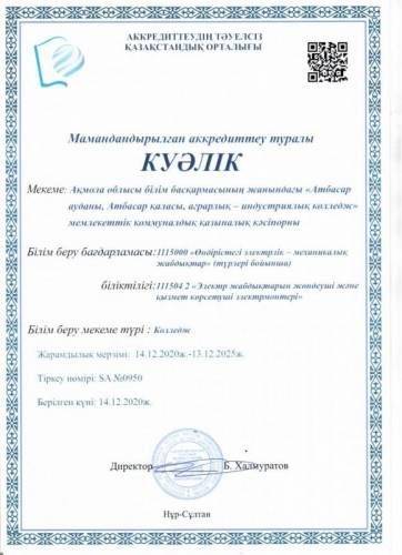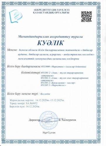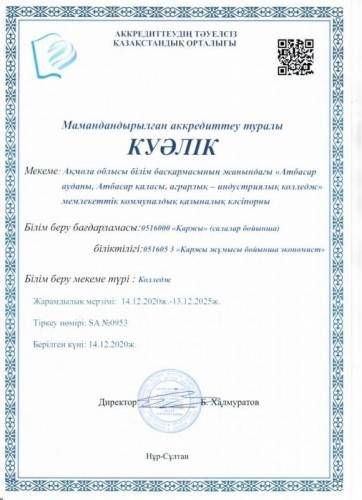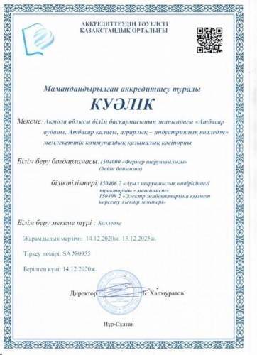 2020 жылғы 23 қарашадан бастап 27 қарашаға дейінгі мерзімде «Тәуелсіз Қазақстандық аккредиттеу орталығы» КЕМ сыртқы сараптау комиссиясының мүшелері Ақмола облысы білім басқармасы жанындағы «Атбасар ауданы, Атбасар қаласы, аграрлық-индустриялық колледж» МКҚК аккредиттеу өткізді. Колледж 7 мамандық, 13 біліктілік бойынша институционалдық және мамандандырылған аккредиттеуді өтті. 2020 жылғы 14 желтоқсан күні аккредиттеу кеңесінің отырысы өткізіліп, Ақмола облысы білім басқармасы жанындағы «Атбасар ауданы, Атбасар қаласы, аграрлық-индустриялық колледж» МКҚК 5 жыл мерзімге