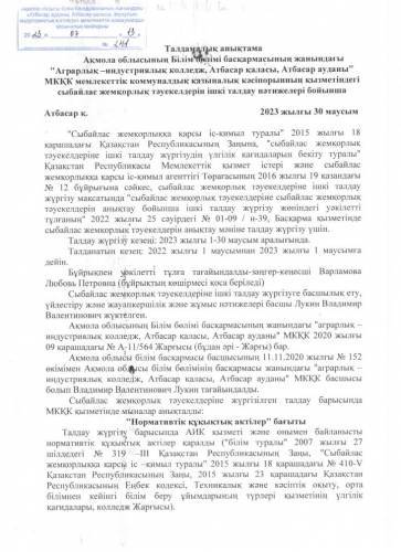 Государственное коммунальное казённое предприятие "Аграрно-индустриальный колледж, город Атбасар, Атбасарский район" при управлении образования Акмолинской области