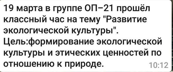 19-наурызда ОП-21 тобында "Экологиялық мәдениетті дамыту" тақырыбында сынып сағаты өткізілді. Мақсаты: Экологиялық мәдениетті және табиғатқа қатысты этникалық құндылықтарды қалыптастыру.