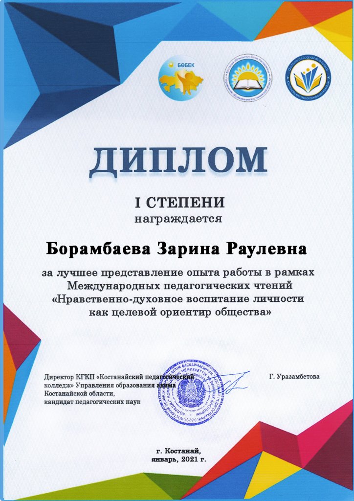 2021 жылғы 29 қаңтар күні Қостанай қаласында «Адами және рухани тәрбие қоғамның мақсатты бағдары ретінде» атты халықаралық педагогикалық онлайн-оқулар өткізілді. Оған «Өзін-өзі тану» пәнінің оқытушысы Борамбаева Зарина Раулевна қатысты. Онлай-оқулардың қорытындысы...
