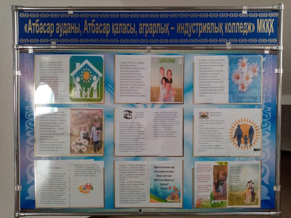 Отбасы күніне арналған апта аясында колледжде "Отбасы және отбасылық құндылықтар" тақырыбында ақпараттық стенд безендіріледі. Отбасы мен отбасылық құндылықтар - ір адамның өмірі құрылатын маңызды іргетас.
