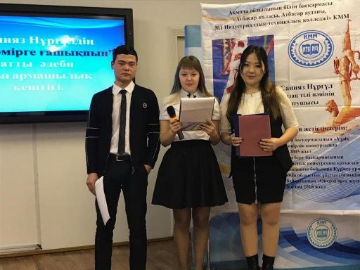 2018 жылдың 14 желтоқсанында "АИК" - те Қ5азақ тілі мен әдебиеті пәнінің оқытушысы Санияз Нұргүл жер мен халыққа арналған "Мен бұл өмірге ғашықпын" атты іс-шара өткізді. Іс-шараға қонақтар шақырылды: колледж директоры М.Р. Молдахметов, аудандық Өмірсерік Шайхин...