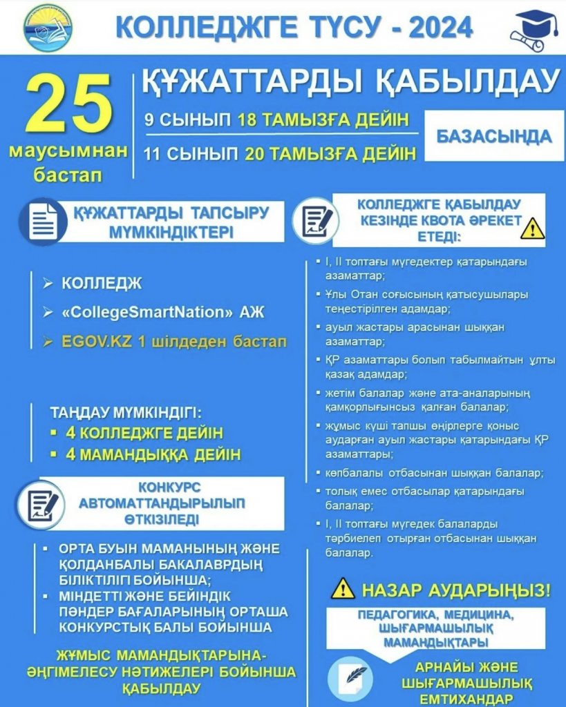 2024 жылғы 25 маусымнан бастап «Атбасар қаласы, аграрлық-индустриялық колледж» МКҚК 2024-2025 оқу жылына білім алушыларды қабылдау бойынша қабылдау комиссиясы жұмыс істей бастайды. Комиссия күн сайын сағат 9:00-ден 18:0-ге дейін жүұмыс істейді. Демалыс күндері – сенбі,...