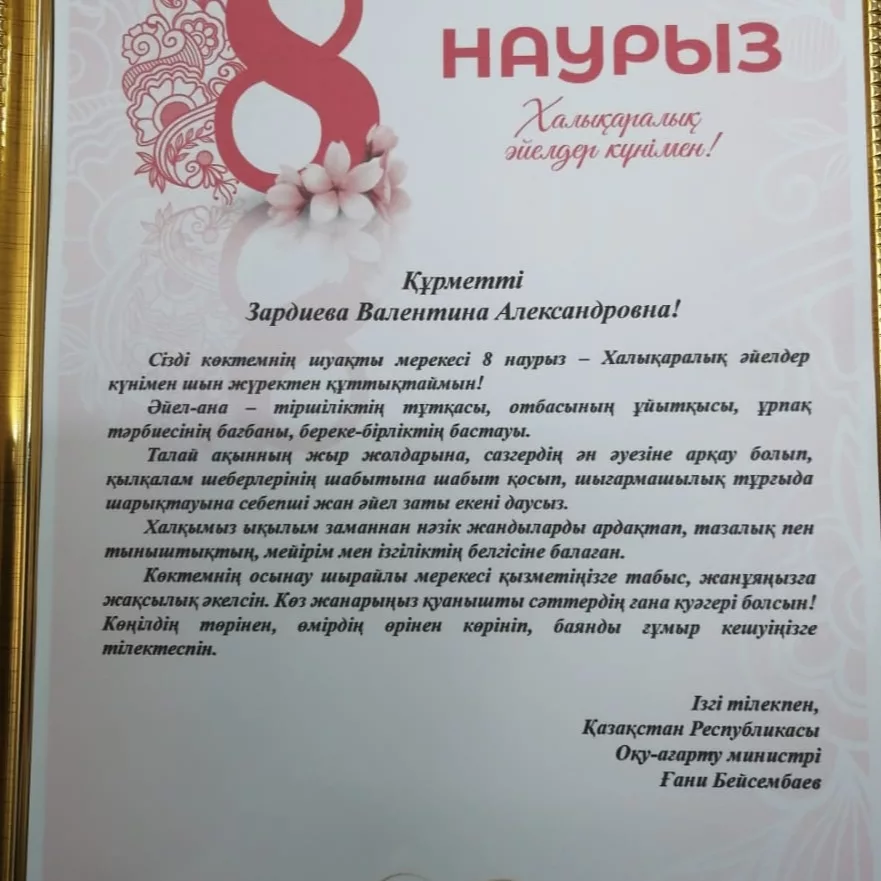 Олар 8 наурыз Халықаралық әйелдер күні қарсаңында Қазақстан Республикасы Білім министрі, оқу-өндірістік жұмыс жөніндегі орынбасары Зардиева Валентина Александровна, оқу ісі жөніндегі орынбасары Омарова Гүлден Ахметжановна құттықтау хатымен марапатталды....