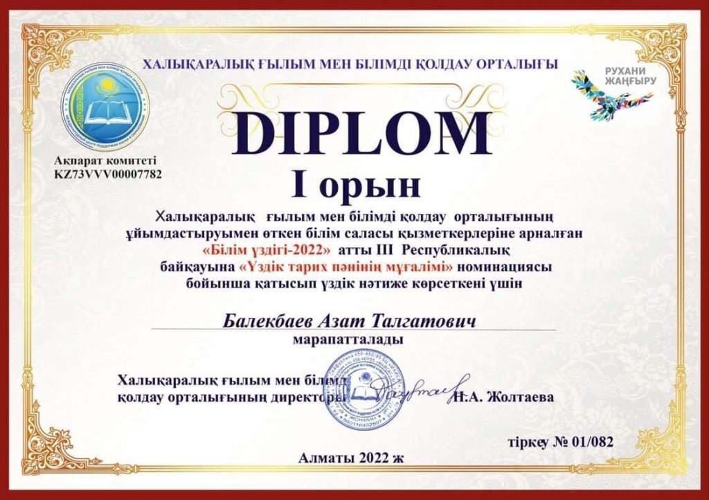Мұғалім Балекбаев Азат Талғатұлы облыстық «Білім үздігі 2022» байқауында «Үздік тарих панінің мұғалімі» номинациясы бойынша 1 орын алғаны үшін марапатталды