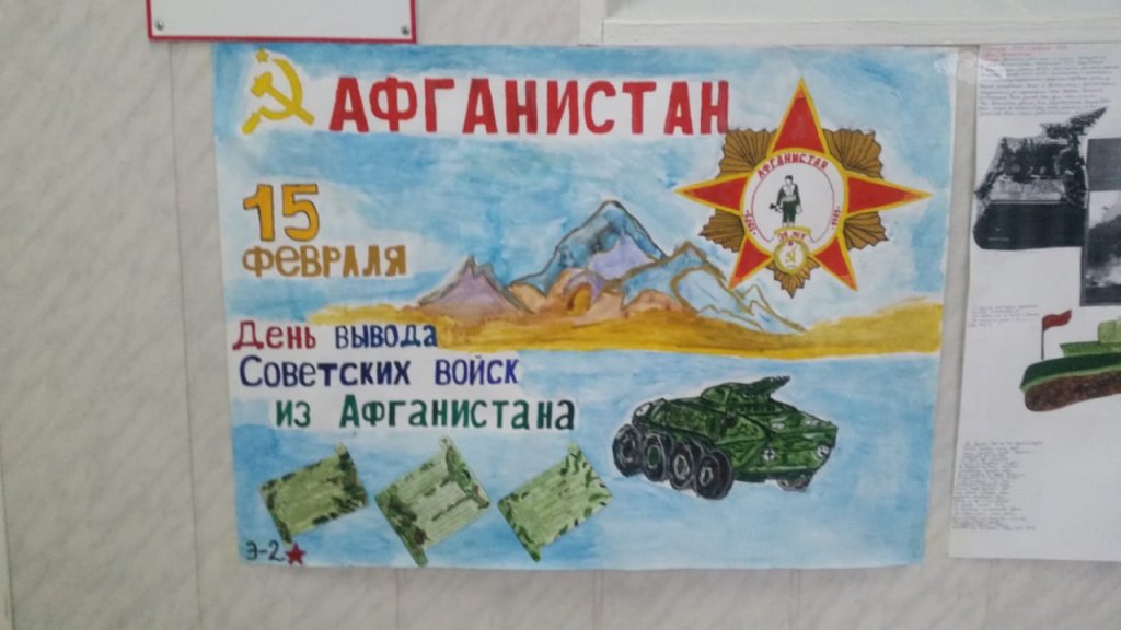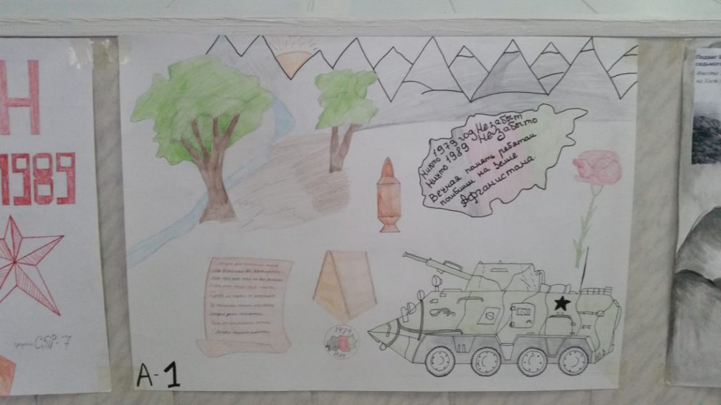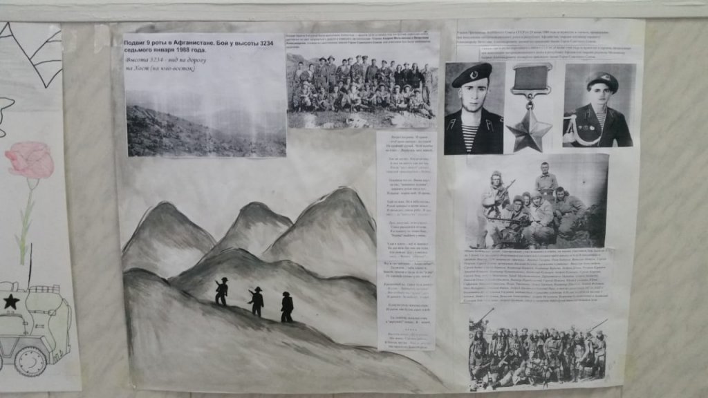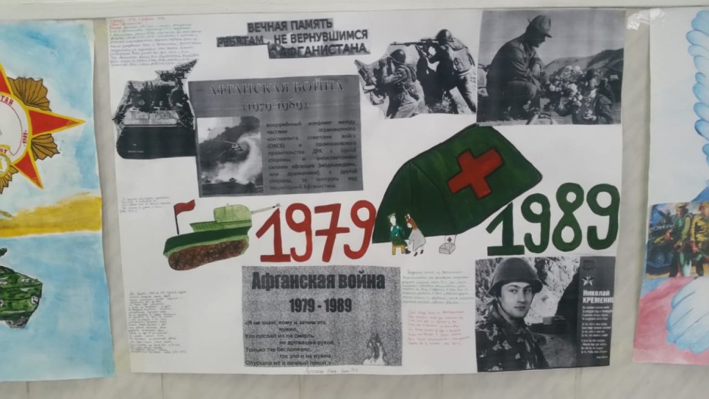Ауғанстан жолдарынан өткен барлық жауынгер-интернационалистерді еске алу үшін «Ауған соғысы туралы біз не білеміз?» Жад аллеясы қабырға газеттері форматында.