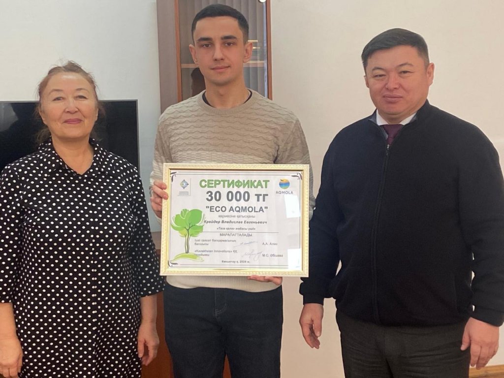 30.000 теңгелік сертификатпен студент Крейдер Владислав пен оның жетекшісі К.К.Байкенова «Таза қала» экологиялық жобаның жұмысы үшін белгіленді.