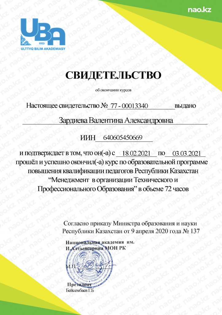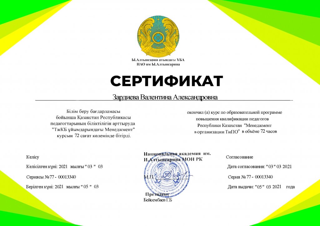 2021 жылдың 18 ақпаны мен 3 наурызы аралығында Ұлттық Академия ұйымдастырған "ТжКБ ұйымындағы Менеджмент" тақырыбы бойынша оқу ісі жөніндегі басшының орынбасары В.А. Зардиева мен оқу ісі жөніндегі басшының орынбасары Г. А. Омарова біліктілікті арттыру курстарынан өтті.Ы. Алтынсариннің «ELAB.AZIA».
