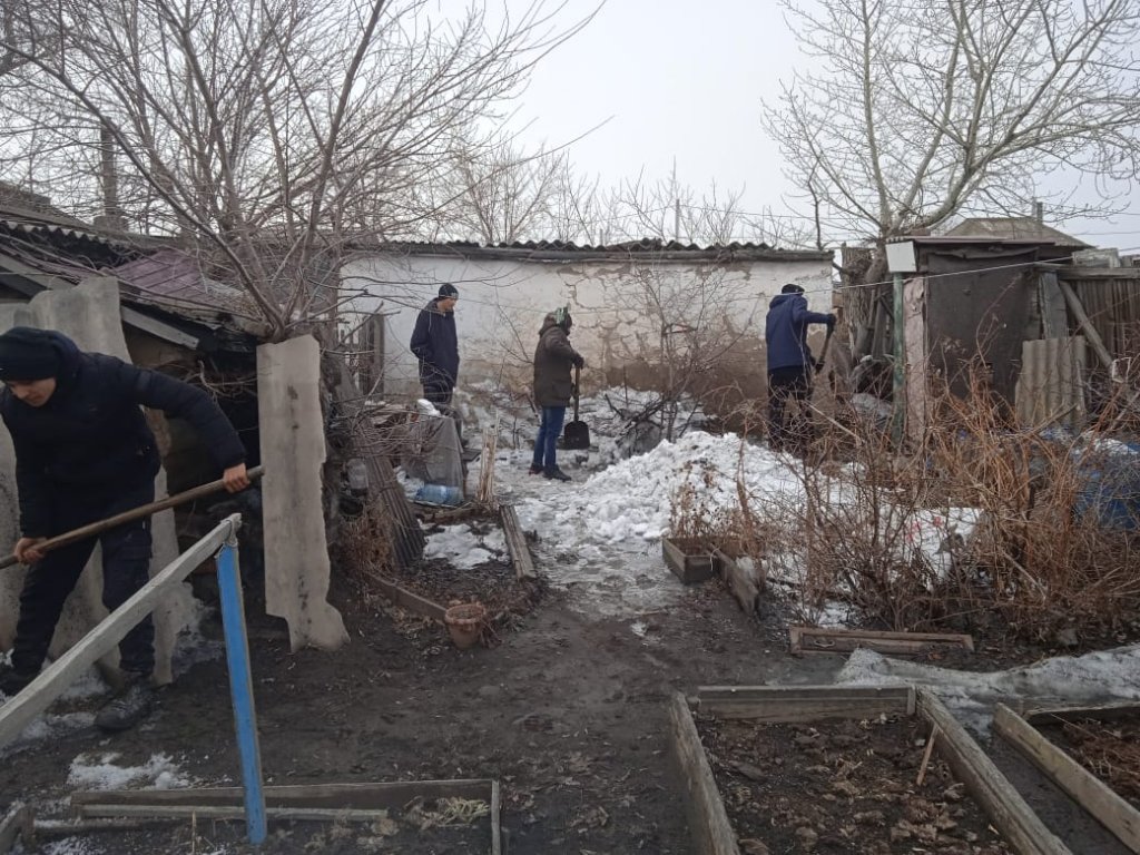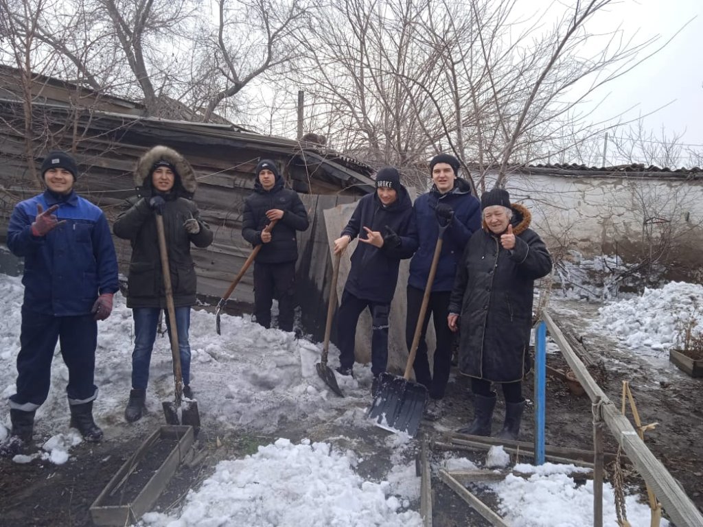 2021 жылғы 09 сәуір күні Э-2 тобының студенттері өндірістік оқыту шебері С.К.Садвакасовтың жетекшілігімен зейнеткер А.С.Федощенкоға үйінің аумағын жинастыруға көмектесті. Әжей көмекке риза болды.