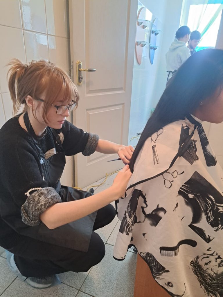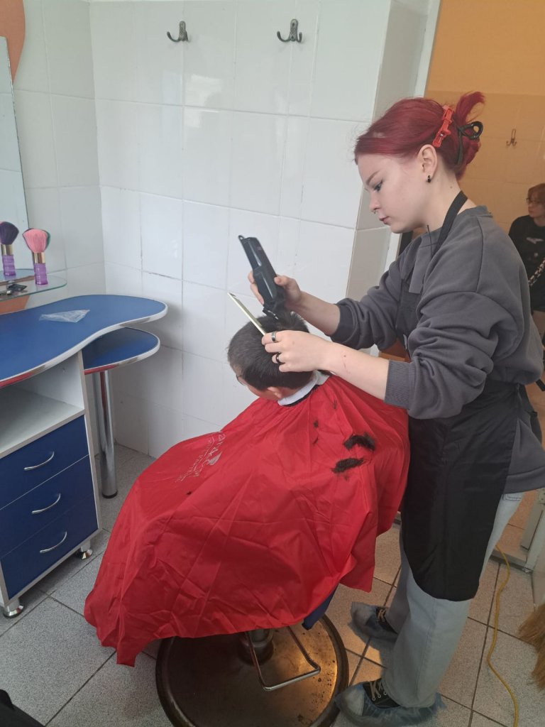 П-34 тобының білім алушылары Кулинская Ирина, Данилова Елизавета, Рудык Евгения ө/о шебері О.К.Баимбетовамен бірге «PROF Марофон:МЕЙІРІМ» әлеуметтік жобысы аясында Атбасар қаласыынң № 2 арнайы мектеп-интернатының тәрбиеленушілеріне шаштараз қызметін ұсынды.