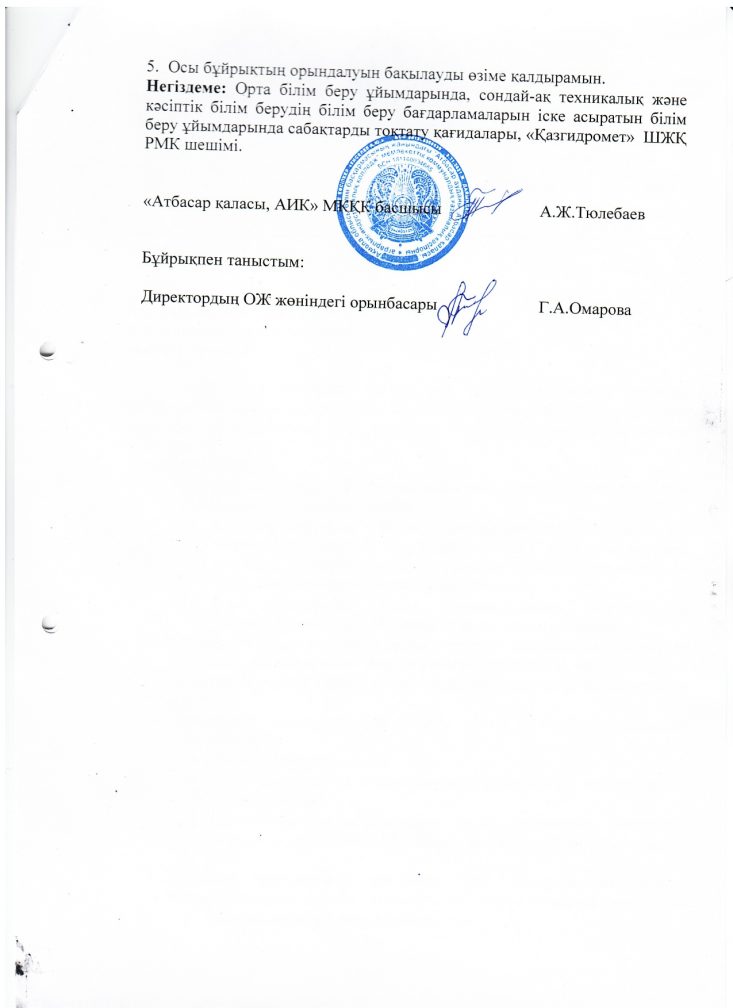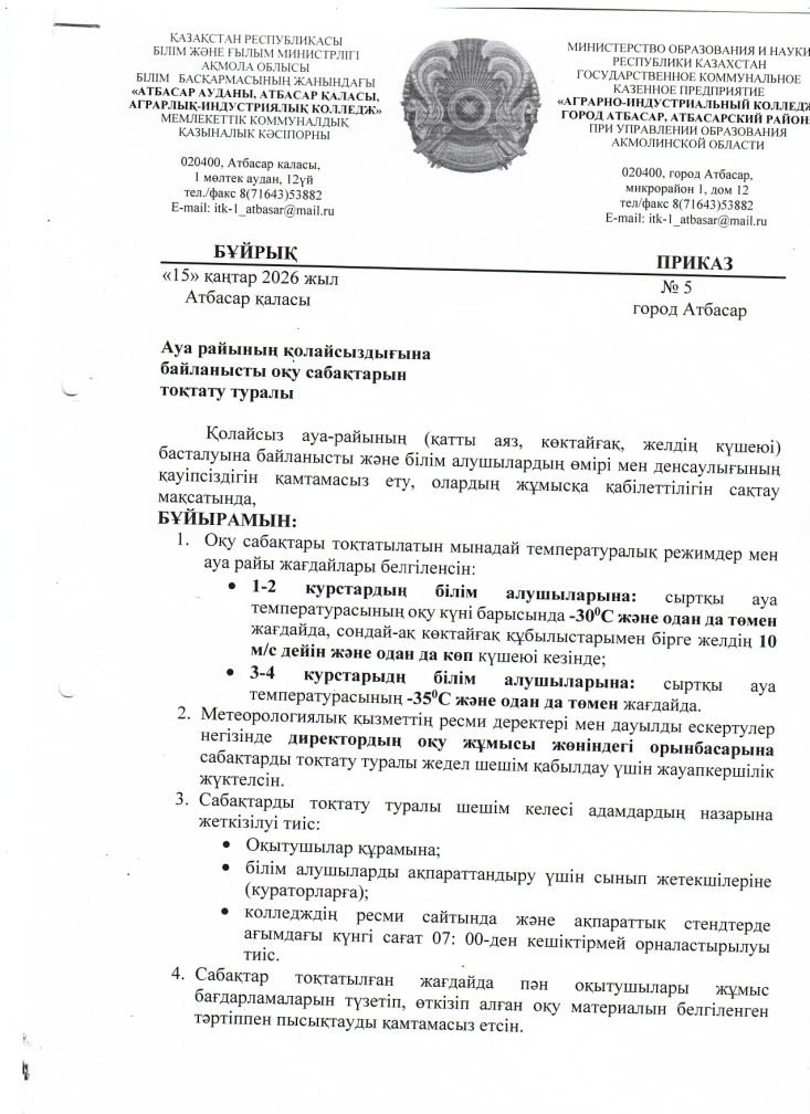 Қолайсыз ауа райы жағдайларына байланысты сабақтарды тоқтату туралы бұйрық