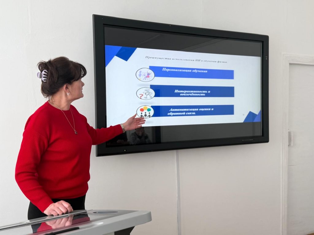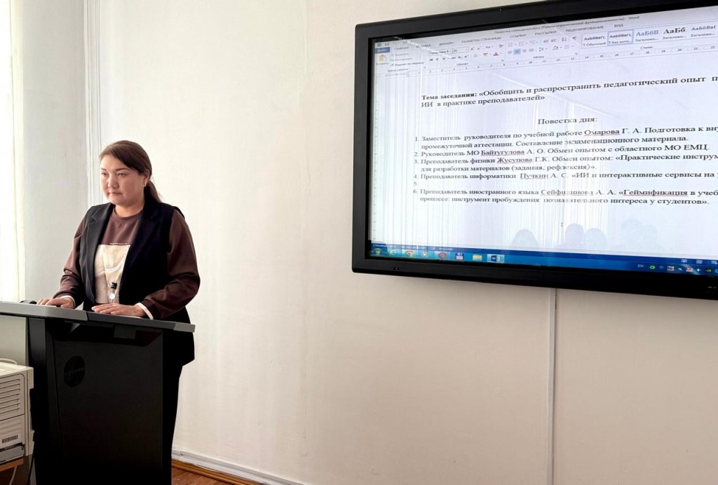 Әдістемелік бірлестіктің басшысы А.О.Байтоғұлова облыстық табиғи-математикалық циклдің тәжірибесін таныстырып, колледждің білім беру ортасына ИИ ықпалдастырудың заманауи тәсілдеріне назар аударды.