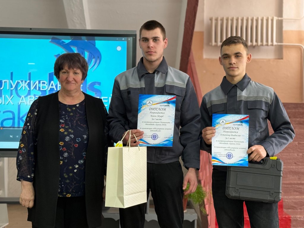 «Жеңіл автомобильдерге қызмет көрсету» құзыреттілігі бойынша – Остапенко Владислав пен Кноль Эдуард, «Электрмонтаж ісі» құзыреттілігі бойынша – Соседа Сергей мен Кулешов Артем, «Шаштараз өнері» құзыреттілігі бойынша – Чернова Василиса, «Дәнекерлеу технологиялары» құзыреттілігі бойынша – Литау Александр, «Наубайханалық шеберлік» құзыреттілігі бойынша – Балекбаева Тахмина, «Аспаздық іс»с құзыреттілігі бойынша – Бояринова Сабина.