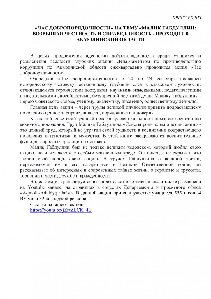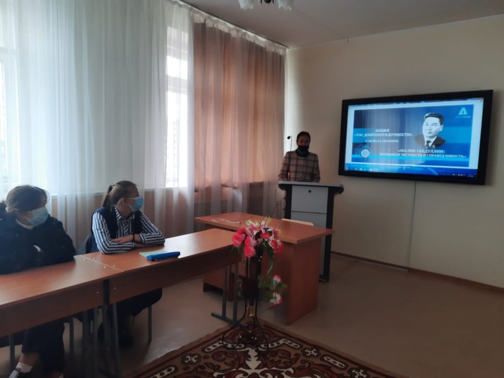 21 қыркүйек күні «Атбасар қаласы, аграрлық-индустриялық колледж» МКҚК ТҰК-11, ТҰК-21, У-3 топтарында «Адалдық пен әділдікті ту еткен Мәлік Ғабдуллин» тақырыбындағы парасаттылық сағаттары өткізілді. Парассаттылық сағаты қазақ руханиятында терең із қалдырған, батырлық іс - әрекетімен, ғылыми ізденістерімен, педагогикалық және жазушылық қабілеттерімен, жанының мінсіз тазалығымен ерекшеленетін тұлға, Кеңес Одағының Батыры, ғалым, қоғам қайраткері Мәлік Ғабдуллинге арналған.