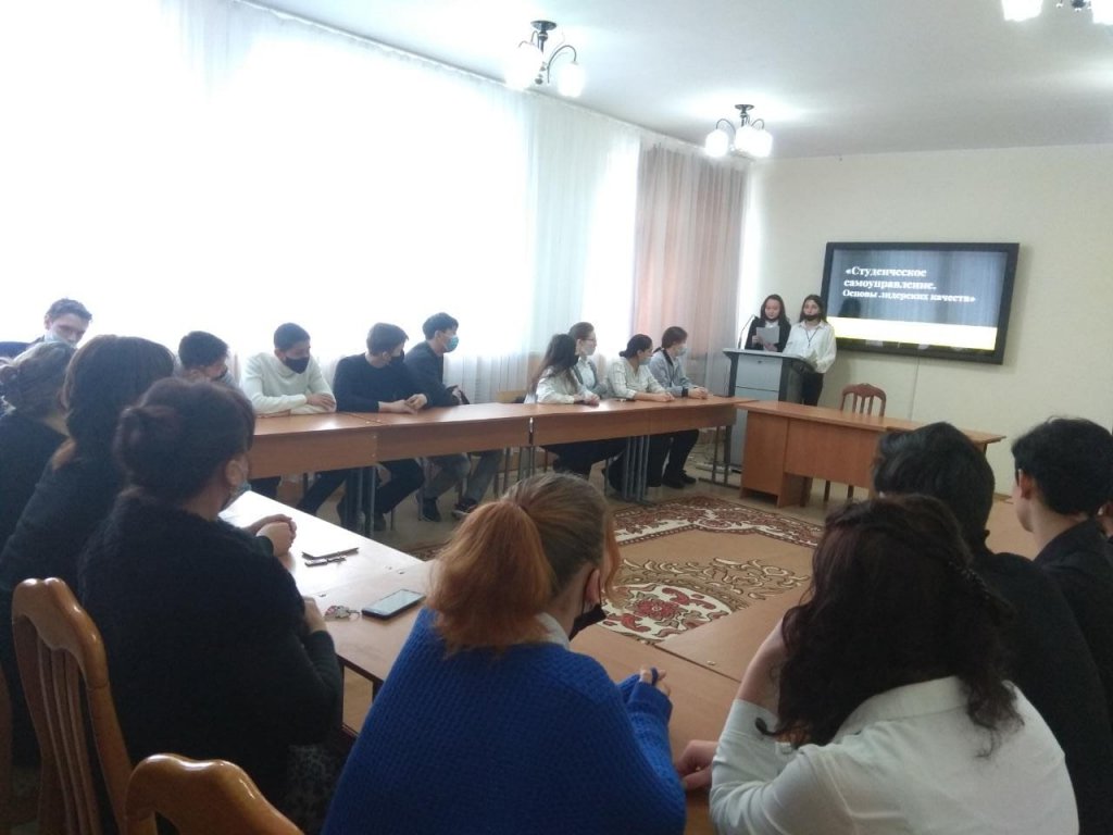 2021 жылдың 29 қарашасында Студенттік Парламент мүшелері Муканова Ж. және Приходько Е. ЕВМ-25 тобымен «Студенттердің өзін-өзі басқаруы көшбасшылық қасиеттерді дамытудың негізі» тақырыбында әңгіме өткізді. Осы тақырып бойынша дайындалған презентацияны Ж.Муканова және Е.Приходко ұсынып, студенттерге сұрақтар қойды. Студенттер спикерлермен белсенді түрде талқылады.