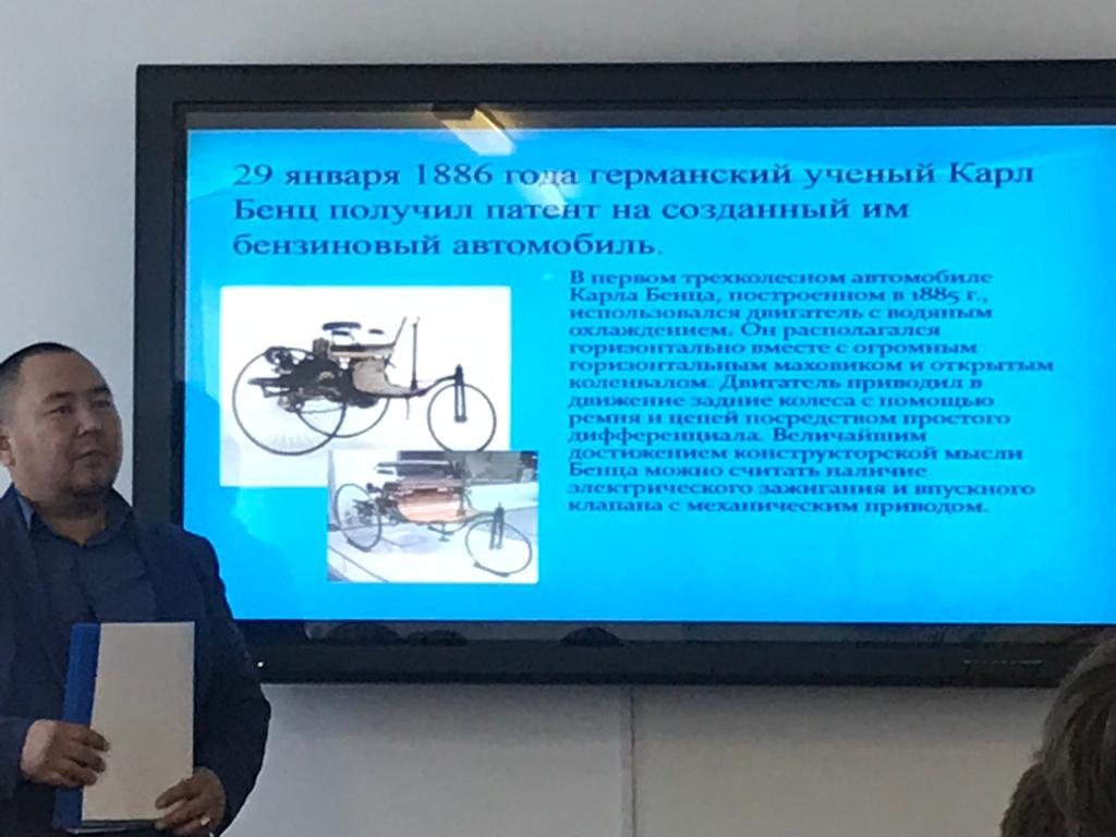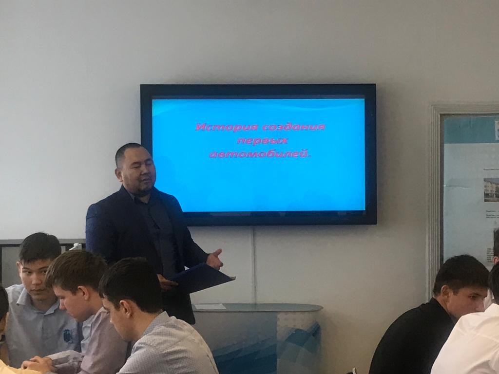 Өндірістік оқыту шебері Тимур Рыспекович Ибраев дайындап жүргізген «Алғашқы автомобильдердің пайда болу тарихы» тақырыбандағы іс-шара да қызықты өтті. Ол сабаққа қатысушыларды құрылымымен таң қалдырған алғашқы автомобильдерді көрсетті. Сауатты таңдалған материал мен сабақ өткізудің бірнеше әдістерін қолдану іс-шараны қызықты әрі тартымды етті. Балалар автомобильдердің құрылымы мен жүргізу тәжірибесінде өз-ара жарысты. 1-2 курстың слесарь-автомеханиктер топтары қатысты.