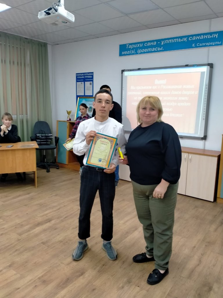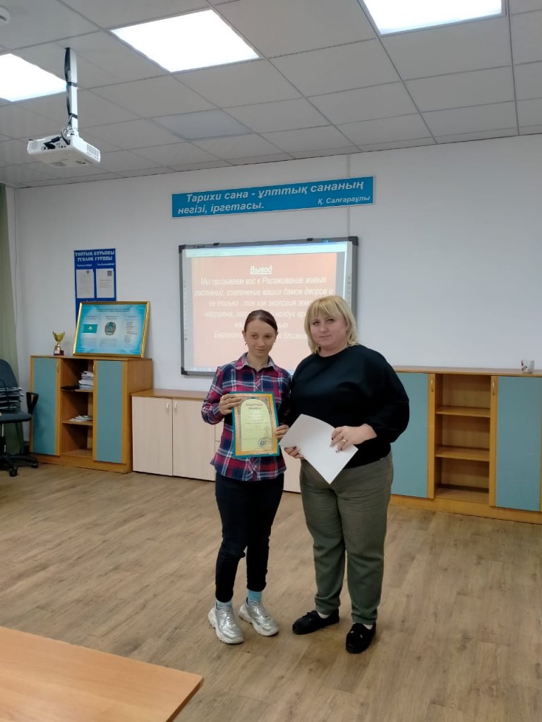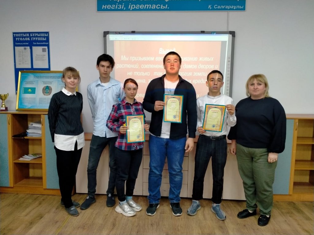 Әрбір топта экологиялық жоба аяқталғаннан кейін ең үздік жобалар таңдалып,олардың арасында қорытынды қорғау жүргізілді. Бірінші орынды ПМСХ-11 тобының білім алушысы Лутфуллин Салават, екінші орынды ФШ-21 тобының білім алушысы Абенов Алан иеленсе, үшінші орынды ТҰК-11 тобының білім алушысы Осипова Валентина қанағат тұтты.
