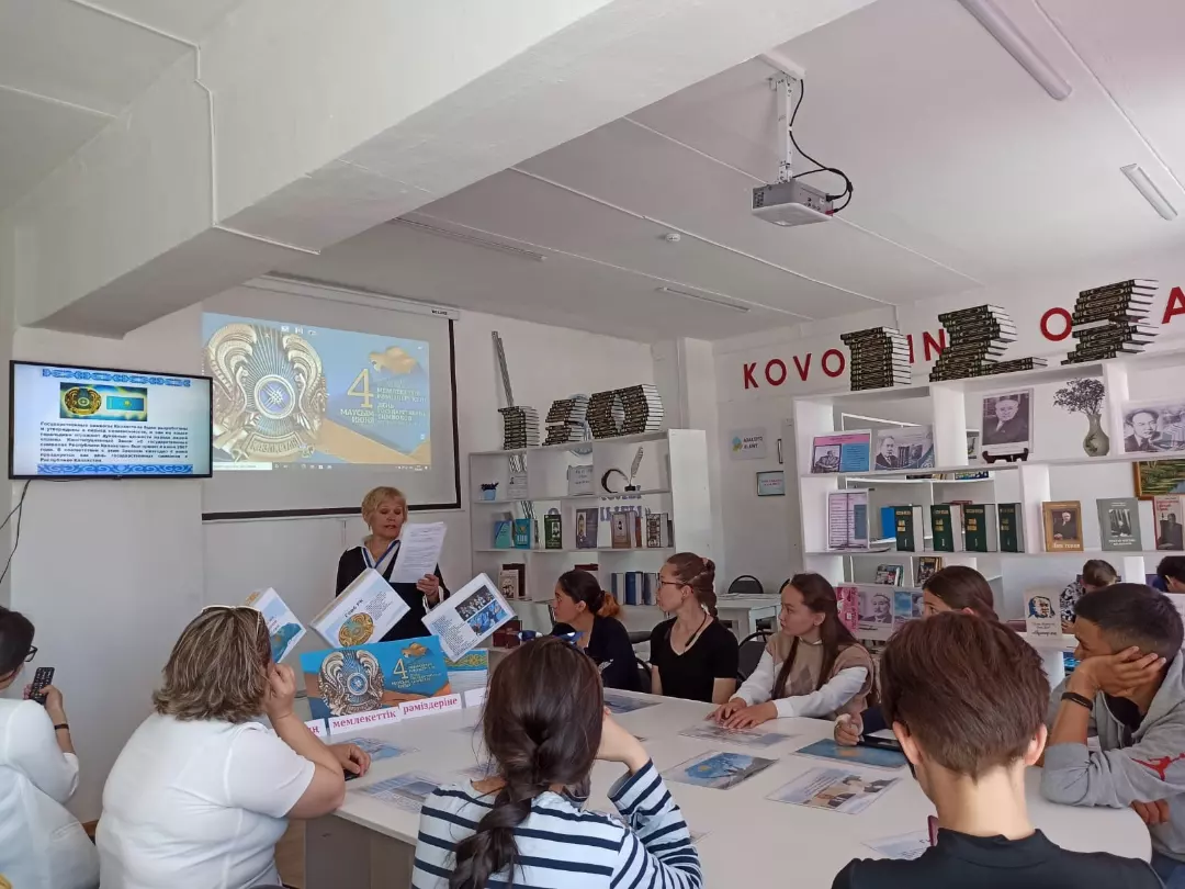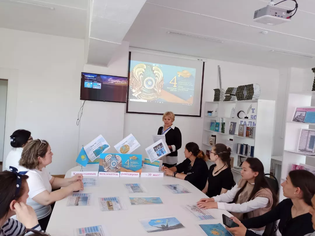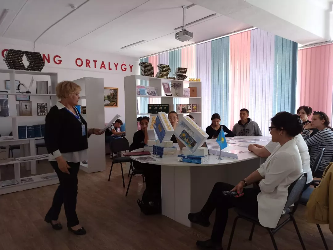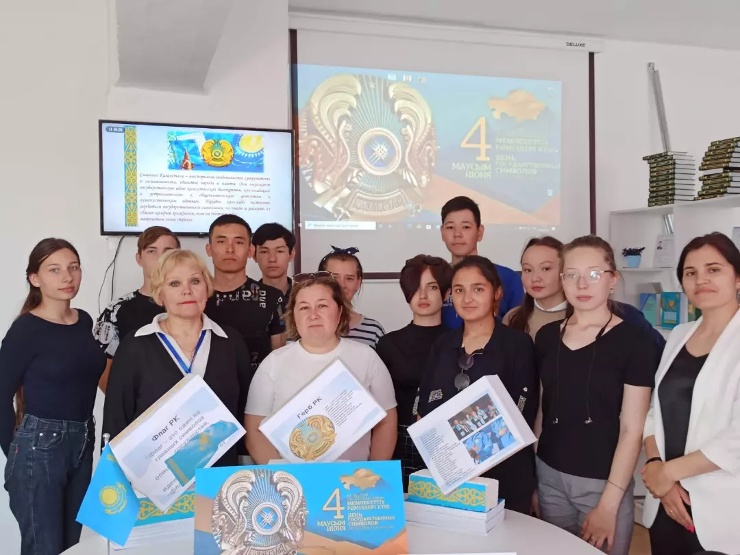 03.06.2022ж.І.Есенберлин атындағы аудандық Орталық кітапхана АИК студенттерімен бірге ҚР Мемлекеттік рәміздерінің қабылданғанына 30 жыл толуына орай "Тарих аясындағы үш символ" атты саяси таным ұйымдастырды.
