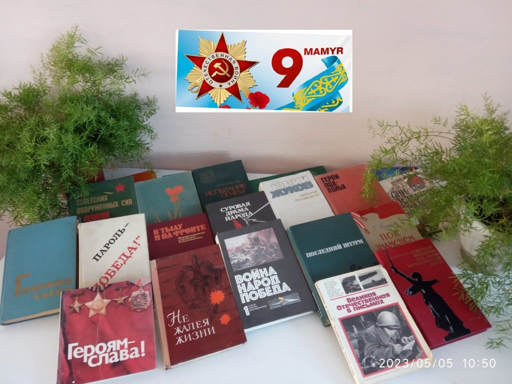 9 мамыр мерекесі қарсанында колледждің кітапханасында тақырыптық кәтап көрмесі безіндірілді. Бұнда 1941-1945 жылдардағы Ұлы Отан соғысына арналған тарихи және көркем әдебиет ұсынылды. Ол кітаптарда біздің отандастарымыз, қазақстандық жауынгерлер Ә.Молдағұлова, М.Мәметова, Т.Бегельдинов, Н.Әбдіров, М.Ғабдұллин, Қ.Қайсенов, Р.Қошқарбаевтар жасаған ерліктер туралы айтылады. Олар Отан үшін және біз үшін қымбат және қасиетті барлық нәрсені қорғау үшін күрескен. Соғыс туралы көркем шығармалар бейбіт өмір үшін күрескендердің ойлары мен сезімдерін сақтайды.
