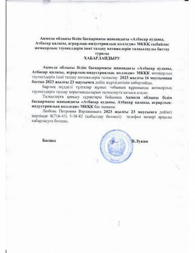 Государственное коммунальное казённое предприятие "Аграрно-индустриальный колледж, город Атбасар, Атбасарский район" при управлении образования Акмолинской области