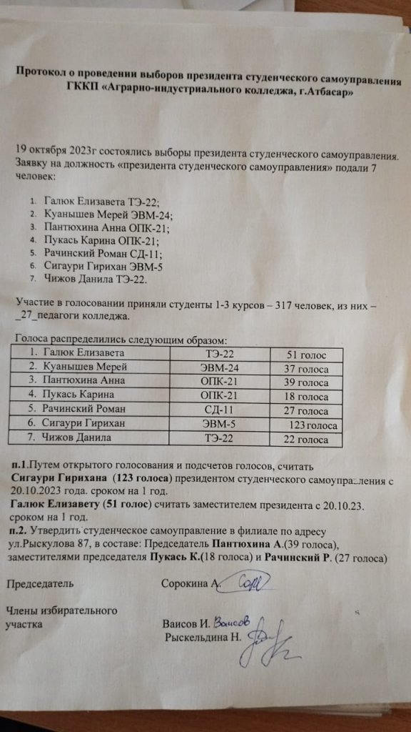 Ағымдағы жылдың 27 қазанында салтанатты жиында студенттік үкіметтің президентін ұлықтау рәсімі өтті. Сайлауда ең көп дауыс жинап, 5-компьютер тобының 1 курс студенті Сигаури Гирихан жеңіске жетті. Оқу бөлімі.