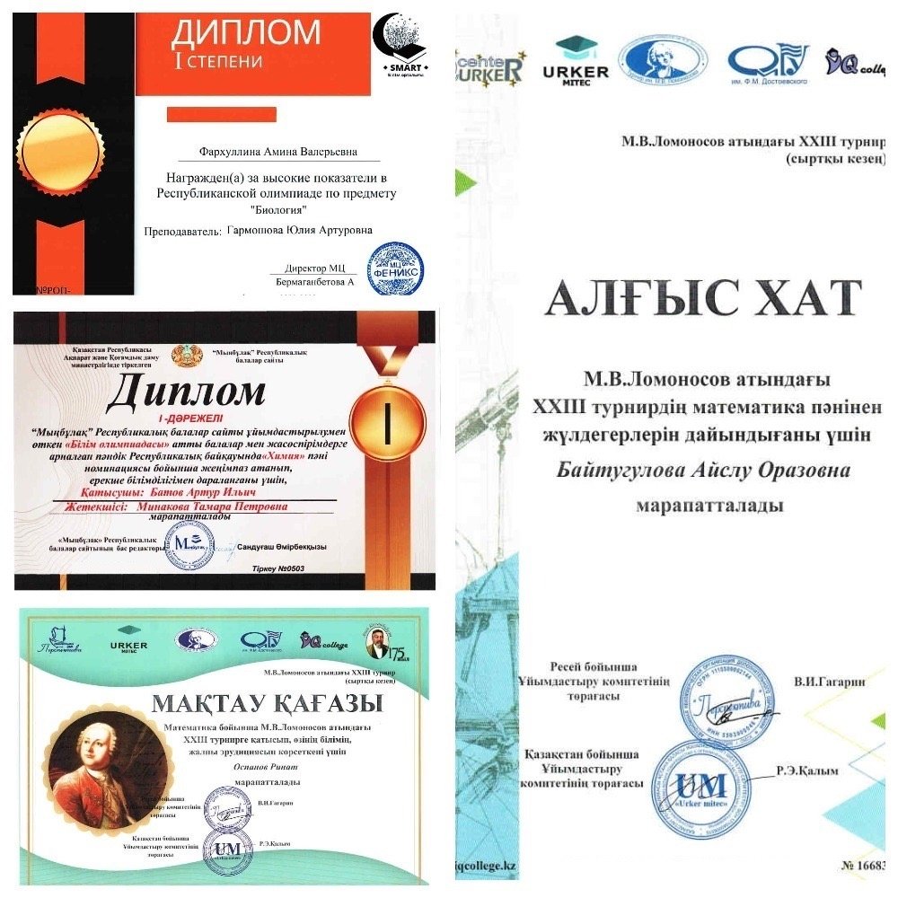 Олимпиадаларға қатысушылар мен жетекшілері Ю.А.Гармашова, Т.П.Минакова, А.А.Ксебаева, Г.А.Омарова, А.С.Пучкин Алғыс грамотарлармен, дипломдармен, Алғыс хаттар және сертификаттармен марапатталды. Оқытушы А.Т.Балекбаев Қазақстан тарихы оқытушыларының қашықтықтан өткізілген республикалық олимпиадасында бірінші орынға ие болып, «Жыл патриоты-2023» номинациясы бойынша облыс әкімі Е.Б.Маржыкпаевтан Алғыс хат алды. Сонымен қатар Қазақстан тарихы бойынша бейне-сабақтар бойынша облыстық байқауда 3 орын иеленді.